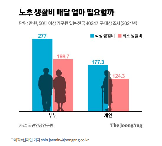 50대 이상 중∙고령자에게 적정 노후생활비를 물어 봤을때 부부는 월 277만원, 개인은 177만3000원이 필요하다는 조사결과가 나왔습니다. (서울은 부부 330만1000원, 개인 205만3000원)