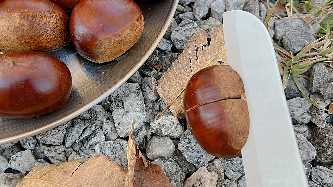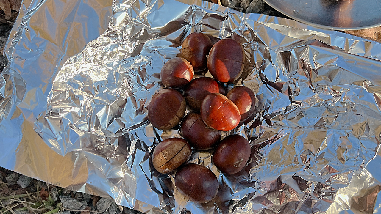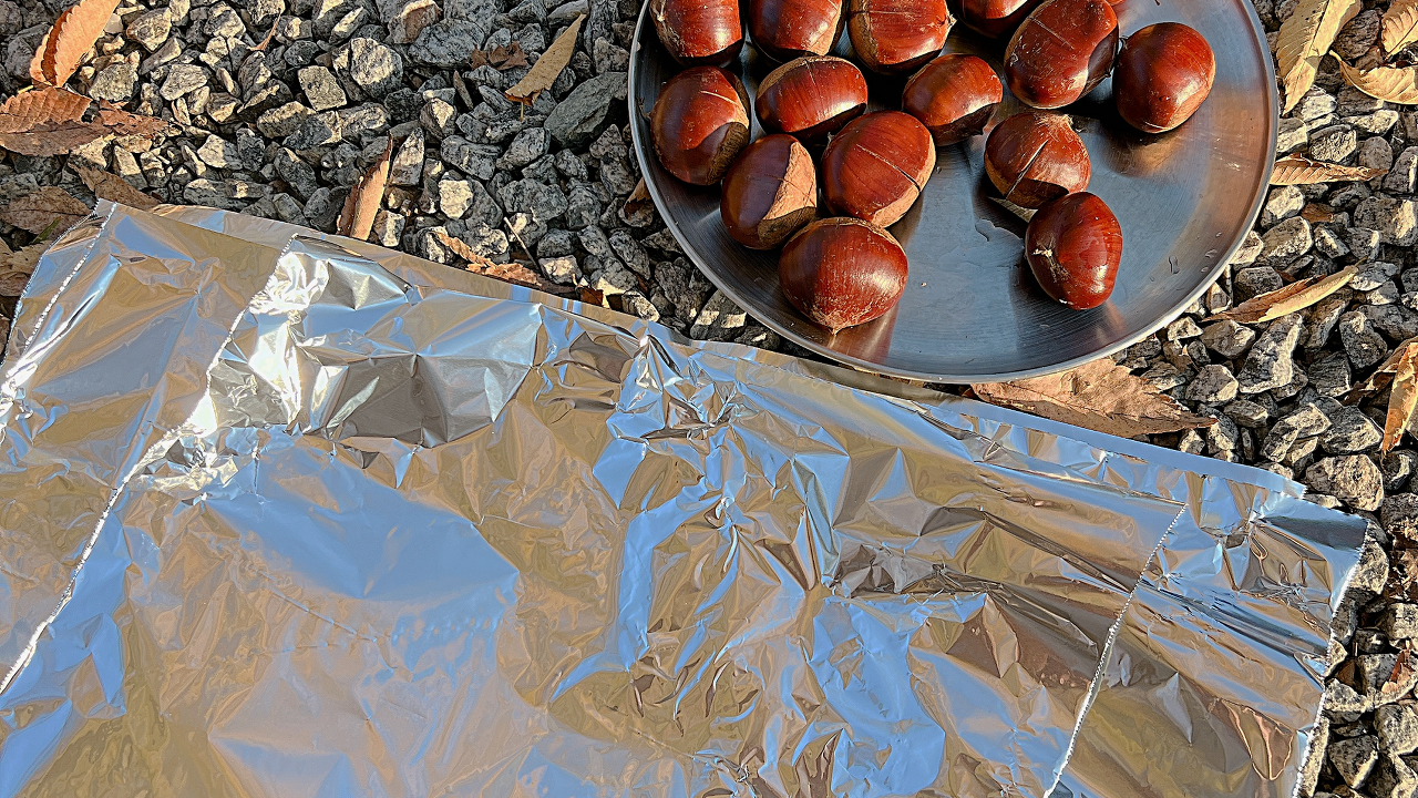 알밤을 화롯대에 구워먹기 위한 준비물 은 간단해요! 알밤, 칼, 쿠킹호일 세가지만 있으면 가능해요.