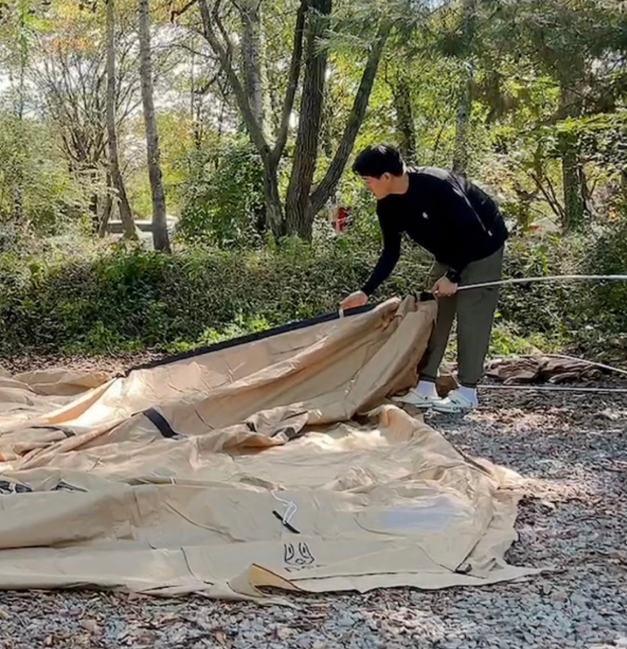 피칭을 위한 1박을 결정후 캠핑장에서 처음으로 가방을 열었어요 열자마자 낙엽색깔과 같은 따듯한 계열의 황토컬러가 너무 예뻤어요. 가방속에는 메인 텐트와 이너텐트, 팩, 폴대4개, 리페어폴 1개가 들어있어요.