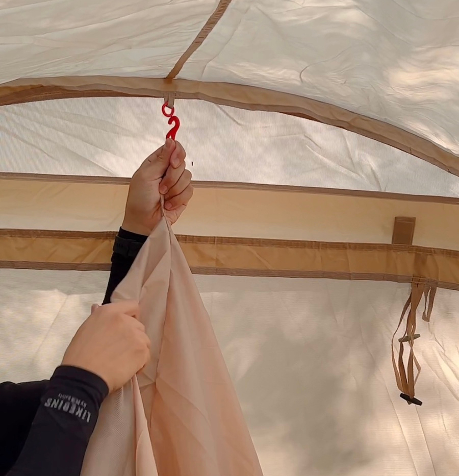 이너 텐트의 중앙 윗쪽은 빨강색 원과 고리로 표시되어있어서 잘 찾아 연결하고 나머지만 자리를 찾으면 아주 쉬워요. 안쪽 부분까지 모두 고리를 체결하고 나중에 바깥 고리를 연결해주세요.
